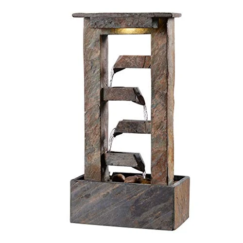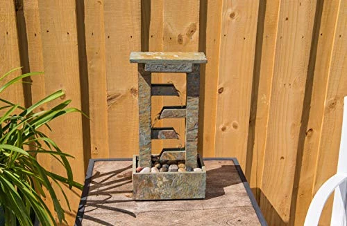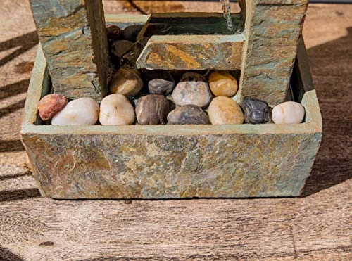 NATURAL MODERN ZEN: Get an easy tranquil feeling at the sight and sound of water falling back and forth between small reservoirs into a bed of polished river stones. The natural green slate on this table fountain gives its geometric profile a natural modern twist, making this contemporary table fountain the perfect finishing touch to any relaxing, spa-like backyard retreat.